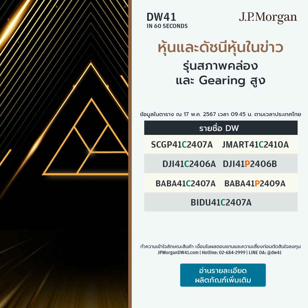 J.P. Morgan DW41 Daily Highlight - 17 พ.ค. 2567: SET50 รับแรงหนุน Dollar Index อ่อนค่าและเงินทุนต่างประเทศไหลเข้า ก่อนหน้าตัวเลข GDP สัปดาห์หน้า