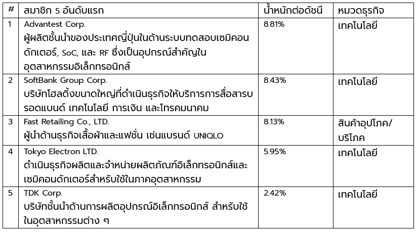 สมาชิกที่มีน้ำหนักสูงที่สุด 5 อันดับแรกของดัชนี Nikkei 225 Stock Averageข้อมูล ณ วันที่ 6 ต.ค. 2568 จาก Nikkei Inc.