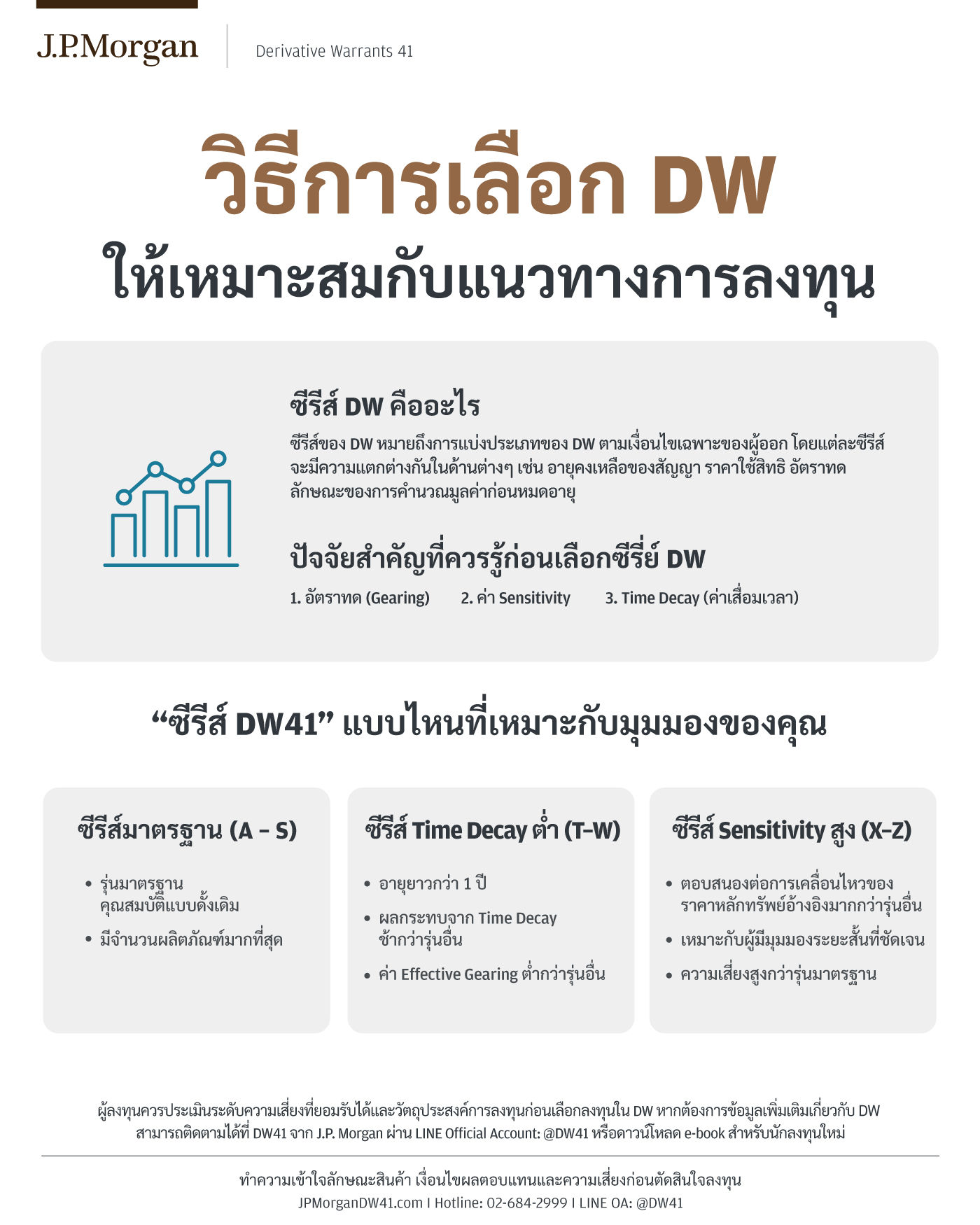 DW41 จาก J.P. Morgan คำนึงถึงกลยุทธ์การลงทุนและความสามารถในการรับความเสี่ยงของนักลงทุนที่แตกต่างกันออกไป จึงมีการออกผลิตภัณฑ์ DW หลากหลายซีรี่ส์เพื่อตอบสนองความต้องการของนักลงทุนแต่ละท่าน